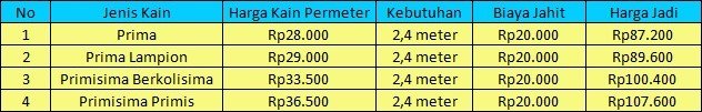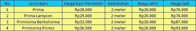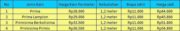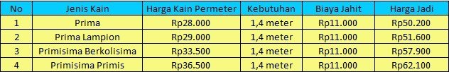 - Untuk semua harga baju jadi yang tertera diatas belum termasuk Furing atau Lining ( kain pelapis bagia dalam dari kain utama ) dan kombinasi model baju tertentu.